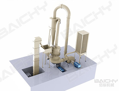 原礦物料細碎后,由提升機將物料送至小料倉,再經振動給料機均勻連續的送入主機磨室內,高壓彈簧產生的作用力和主軸的高速旋轉產生的作用里,一并轉換為強大的離心力,磨輥向外擺動,緊壓于磨環,鏟刀鏟起物料送到磨輥與磨環之間,在強大的離心力下,磨輥滾動碾壓可將物料一次性研磨更加透徹。物料研磨后的細粉隨鼓風機的循環風被帶入分析機進行分選,細度過粗的物料落回重磨,合格細粉隨氣流進入成品旋風集粉器,并經出粉管排出,即為成品。在磨室內因被磨物料中有水分,研磨時生熱,水氣蒸發,以及整機各管道接口不嚴密,外界氣體被吸入,使循環氣壓增高,保證磨機在負壓狀態下工作,所增加的氣流量通過余風管排入除塵器,被凈化后排入大氣。