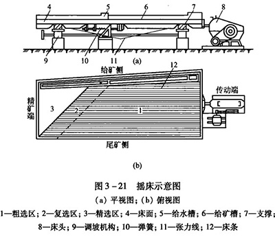 搖床的選礦過程是在具有來復條的床面上進行的,礦粒群從床面上角的給礦槽送入,同時由給水槽供給橫向沖洗水,于是礦粒在重力,橫向流水沖力,搖床床面作往復不對稱運動所產生的慣性和磨擦力的作用下,按比重和粒度分層,并沿搖床床面做縱向運動和沿傾斜床面做橫向運動。因此比重和粒度不同的礦粒沿著各自的運動方向逐漸沿對角線呈扇形流下,分別從精礦端和尾礦側的不同區排出,被分成精礦,中礦和尾礦。